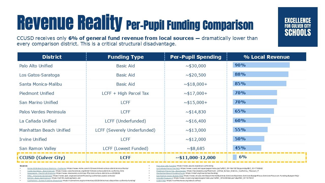 That’s why we’re exploring the idea of a sliding-scale parcel tax - a way for our community to raise stable, locally controlled funding that stays right here in Culver City, supporting our students directly. It’s worked for other California school districts, including Berkeley and Alameda, and we think it can work here too.